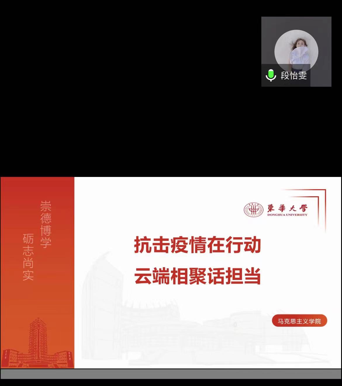 线上主题班会 马理21硕的段怡雯同学作为党员代表在发言中表示,面对疫情,党员同志们更要以实际行动,发挥模范带头作用,彰显青年党员的使命担当;曹月晨同学因疫情被隔离在家,与同学们分享了居家线上学习的方法、调整心理状态的技巧;马理20硕罗海旗同学作为班干部代表发言,号召同学们疫情期间坚持“三件套”、“五还要”的防疫要求,不焦虑、不恐慌、不信谣、不传谣,积极配合落实学校各项防疫要求;纪沛彤同学作为学院研究生进东华附校讲党史思政课的具体负责人,正协助学院积极组织同学们推进“伟大精神”系列课程视频录制等工作,结合集体备课的实践,分享了疫情期间如何做好学习宣讲不断线的体会。