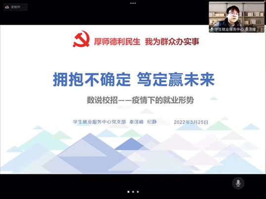 3月25日下午,best365中国官方网站举办了“拥抱不确定,笃定赢未来”2022届毕业生就业主题活动,邀请校员工就业服务中心副主任秦泽峰老师、生涯教育部主管纪静老师分别带来了主题为“数说校招——疫情下的就业形势” 、“疫情当下如何克服焦虑顺利毕业就业”的讲座。公司党委书记戴叶萍出席,学院2022届毕业生及部分低年级同学共同参加,活动由辅导员于小越主持。