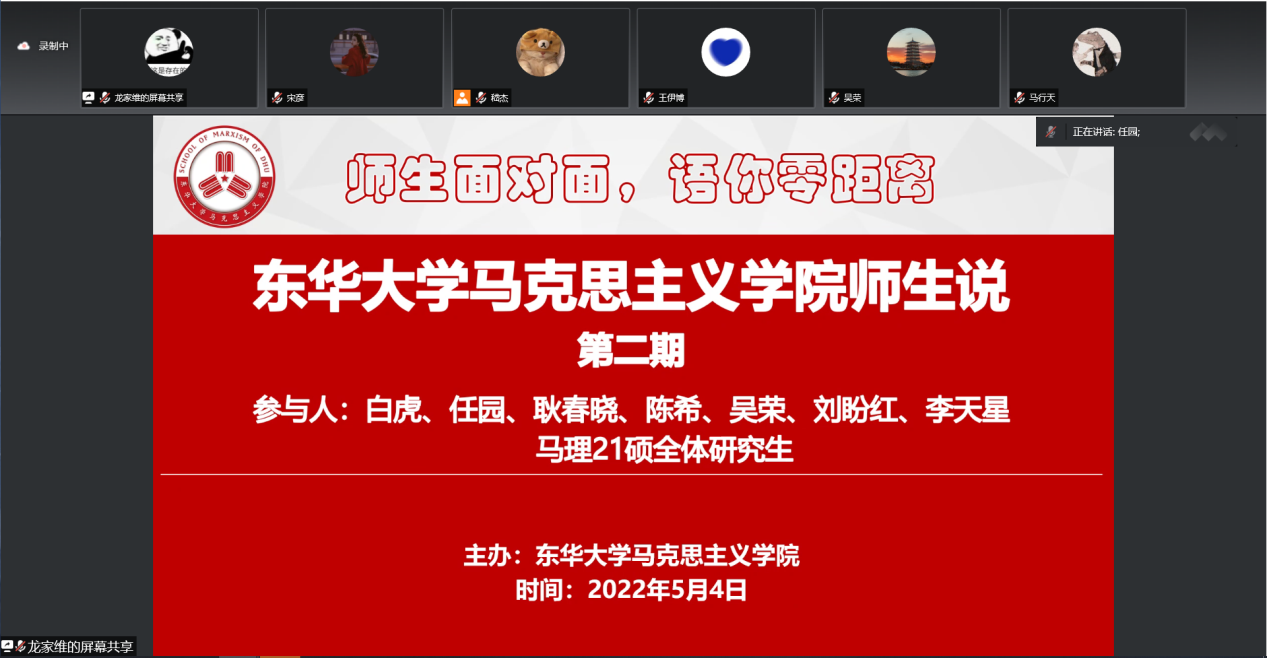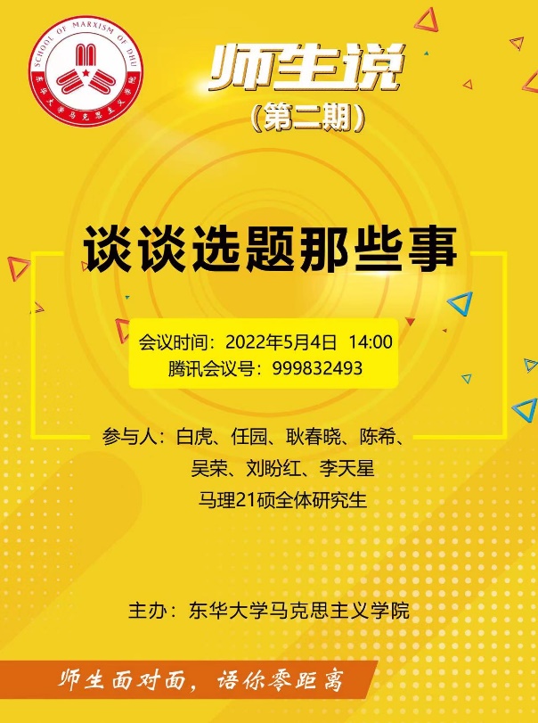 5月4日,正值五四青年节,best365中国官方网站举行了“师生说”系列主题活动第二期——“聊聊选题那些事”。本期主题活动由白虎、任园、耿春晓、陈希、吴荣、刘盼红、李天星七名青年教师与马理21硕全体研究生在云端面对面、零距离共话成长。