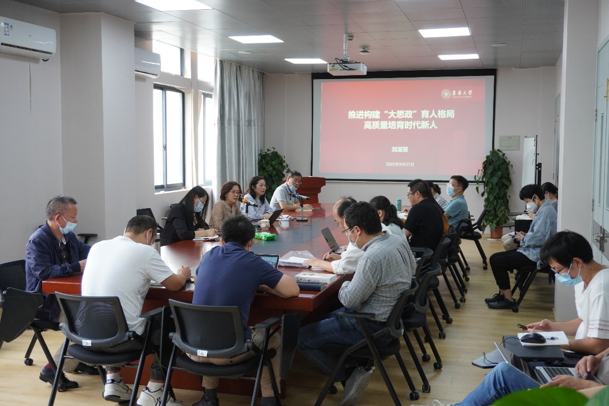 刘淑慧副书记在讲课中指出,要紧扣立德树人,从契合新时代思政教育的内在规律和回应学校思政工作难点的角度,深刻认识构建“大思政”育人格局的重要性和必要性;要准确把握重点,通过健全三全育人体制机制、开展时代新人培育工程、探索构建“大教师”工作格局等,扎实推进“大思政”育人工作走深走实;要抓实主体责任,强化协同联动,严守底线思维,体系化构建“大思政”育人格局。她最后强调,思政课教师要站稳讲台,切实发挥好思政课在育人过程中的主渠道作用。马克思主义公司要认真开展好迎接学习贯彻党的二十大相关工作,及时将党的二十大精神融入思政课教学,以实际行动迎接党的二十大胜利召开。