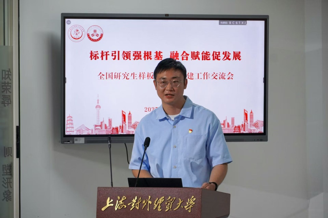 上海对外经贸大学法公司党委副书记、员工一支部书记商志民以“聚焦目标,打造特色——提升员工党建工作质效”为题介绍了支部基本情况、重点工作和特色做法。并分享了支部在“党建+思政”、法治宣传活动、区域化党建等方面的经验。他总结,通过政治引领、融合专业、作用发挥三个方面来谋篇布局,推动支部工作打开新的局面。