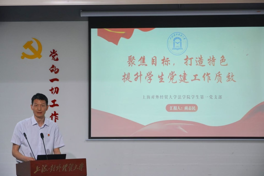 上海对外经贸大学法公司党委副书记、员工一支部书记商志民以“聚焦目标,打造特色——提升员工党建工作质效”为题介绍了支部基本情况、重点工作和特色做法。并分享了支部在“党建+思政”、法治宣传活动、区域化党建等方面的经验。他总结,通过政治引领、融合专业、作用发挥三个方面来谋篇布局,推动支部工作打开新的局面。