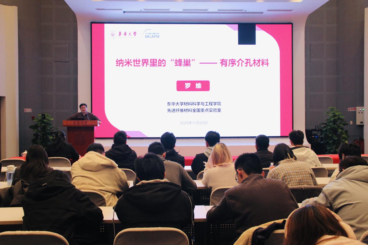 罗维教授从国家科技发展战略需求出发,指出发展前沿材料是推动新质生产力、实现高水平科技自立自强的重要支撑。他强调,习近平总书记提出“用好学科交叉融合的‘催化剂’”的重要论述,点明了材料科技创新的重要趋势和方向,以有序介孔材料为代表的纳米材料,已成为国际科技竞争的战略高地,在高效催化、绿色能源、智能传感等领域展现出变革性应用前景,是提升国家战略科技力量不可或缺的一环。他围绕“如何实现介孔材料的功能化与智能化”这一核心命题,重点介绍了其团队在仿生自组装、模块化构建等方面取得的系列创新成果,生动展现了通过基础研究的原始创新,推动材料从“实验室样品”向“产业应用基石”转化的东华实践。 “材料科学的终极目标,是理解结构-性能关系,并以此创造服务于国家与人民的先进材料。”罗维教授结合团队将介孔材料应用于低能耗制氢、高容量电池、污染物深度净化等具体案例指出,面向国家重大需求的科研选题,不仅彰显了材料研究的价值,更能激发持续创新的内生动力。他勉励同学们主动拥抱学科交叉机遇,在探索微观世界的过程中找到兴趣点与研究方向,将个人成长融入科技报国的时代使命。 作为《锦绣中国》“思政引领、科技赋能、创新驱动”课程体系的重要一环,本次讲座深化同学们对于材料科学前沿的认知,在现场引发了强烈共鸣和热烈互动,员工们纷纷表示收获满满。纺织学院蒋佳城同学表示:“罗教授揭示的介孔材料特性,为我打开了功能性纺织品研发的新思路,例如利用其高比表面积开发智能吸附与传感纤维,这让我看到了专业交叉创新的巨大潜力。”物理学院韩佑铭同学谈到:“从自然界的启示到人工结构的精准合成,让我深刻体会到‘结构决定性质’这一科学定律的魅力,微观尺度下的有序构建,正是支撑未来宏观技术革命的基石。” |
